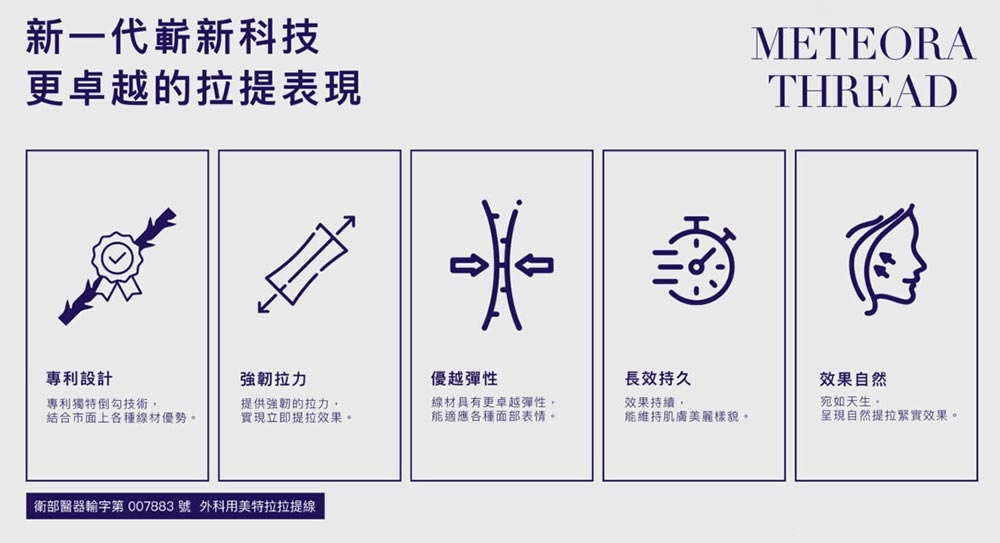 由台灣的皮膚科醫師研發的線材,是醫美界中的奧斯卡-「金線獎」指定線材,更是MIT台灣之光,以符合亞洲人的皮膚特點與醫師長期臨床診治經驗所設計,美特拉提線擁有360度雙向倒鉤與專利45度鉤角設計,能夠更持久、不易斷裂,「美特拉3.5代」,延續美特拉線材長效拉提的效果,另外增加極細外導管,在微創拉提的過程中更快速、佈線更精準,只要午休時段花七分鐘,即刻完成無痕埋線拉提!
