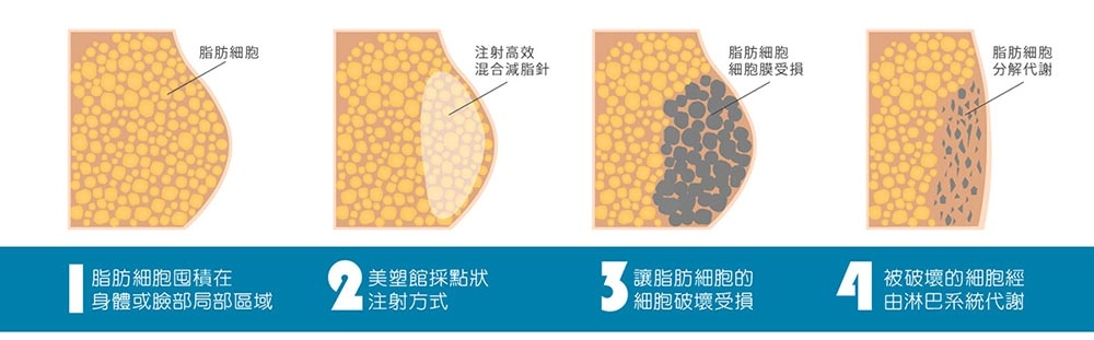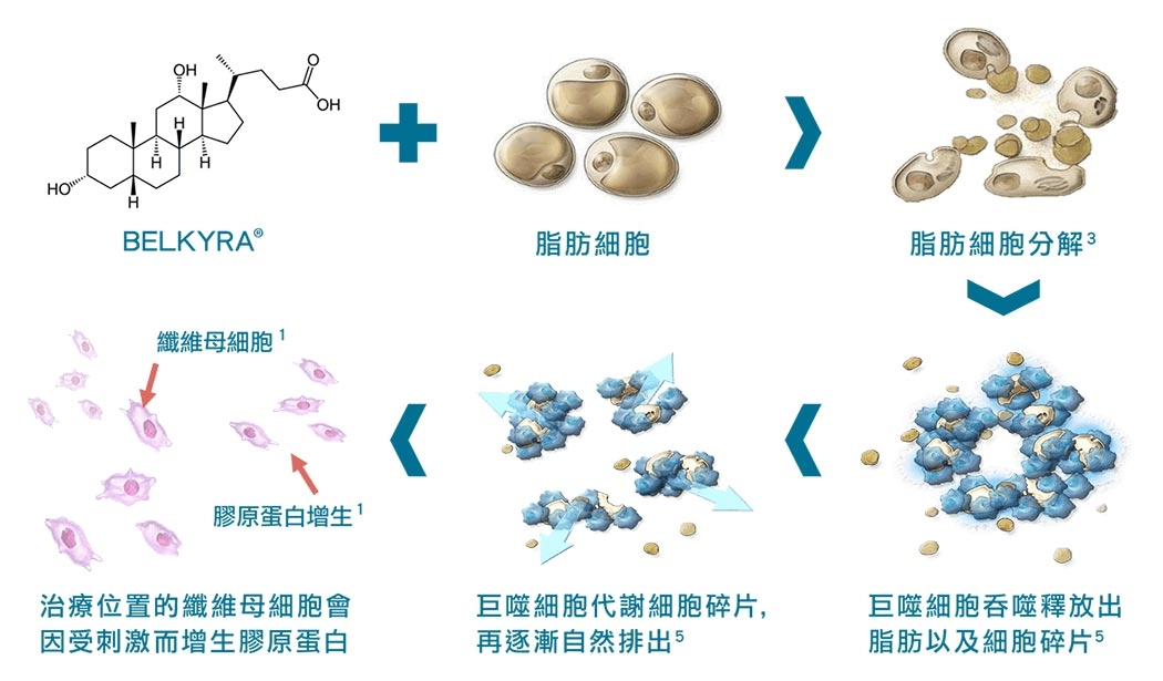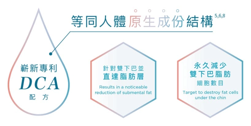 去氧膽酸 Deoxycholic Acid (DCA) 注射針劑 – 注射至皮下脂肪時,DCA會破壞脂肪細胞的細胞膜,導致不可逆轉的脂肪細胞分解。