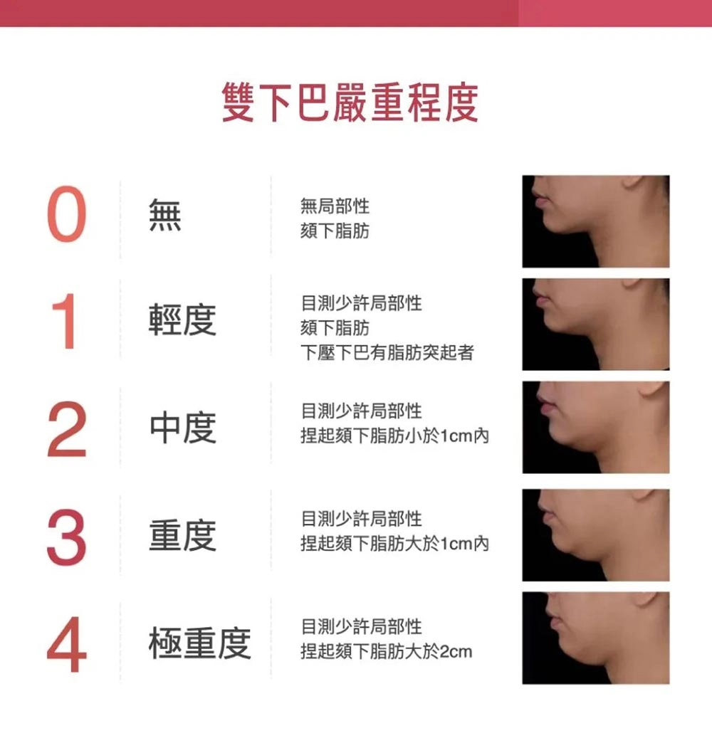醫師會根據雙下巴的脂肪層級進行評估劑量,單次治療最多注射10ml。每次的注射時間應相隔至少1個月,最多可以進行六次治療。