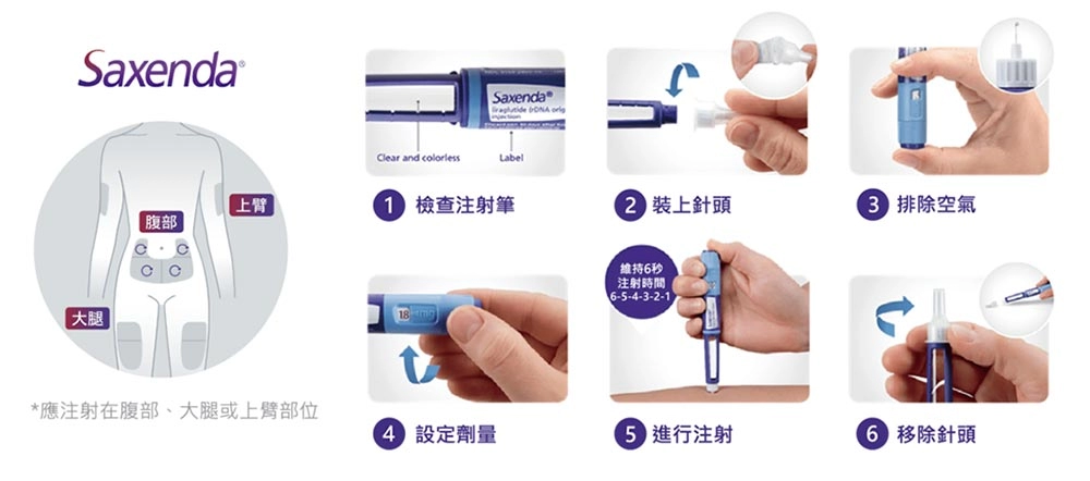 Saxenda善纖達瘦瘦筆每天僅須施打一次,可在一天中的任何時間使用,無須刻意選擇空腹或是飯後,也不用隨用餐時間調整,但建議最好能固定在每天大約相同的時間注射。而每天一次的皮下注射,可以選擇腹部(避開肚臍周圍5cm以外)、上手臂(後上外側),或大腿前外側,不過建議以腹部與手臂範圍為優先施打瘦瘦筆的部位。