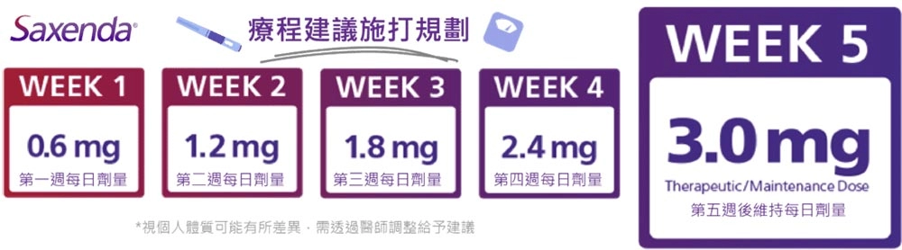 完整的Saxenda善纖達產品為一盒三入,每支筆的容量為3ml(毫升),並含有18mg(毫克)的藥劑成分。建議起始劑量為每日一次 0.6 mg,施打至少第一週後,可逐漸以每周為單位、每次再增加 0.6 mg,直至第五周起維持每日一次 3.0 mg的施打劑量。