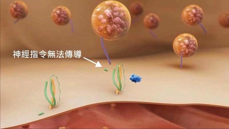肉毒桿菌素與神經纖維末梢結合,持續抑制乙醯膽鹼釋放,導致突觸失去傳遞神經訊號的功能,使肌肉處於放鬆、不易被過分運動的狀態。