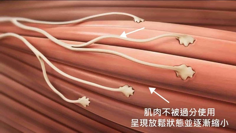 肌肉在放鬆後張力減低,肌肉束纖維漸漸縮小,不再容易牽動皮膚而產生表情以及動態紋,也可以減少肌肉體積達到瘦臉、瘦小腿或是瘦肩的效果。