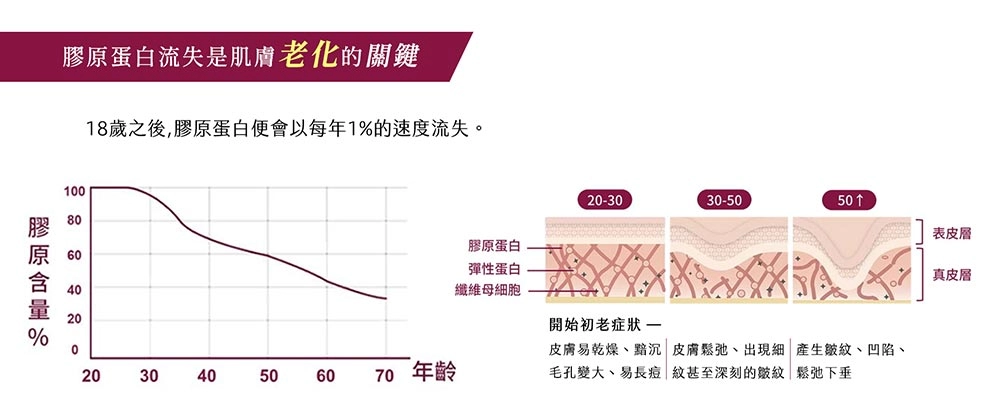 隨著年齡的增長,老化斷裂的膠原蛋白無法交聯膠原蛋白基質,使得纖維母細胞的活力減退。加上平均每年約流失1%的膠原蛋白,導致皮膠原蛋白的產生速度比不上流失的速度,肌膚的支撐力將變得不足,漸漸失去彈性、深淺皺紋、鬆弛下垂等老化現象也隨之出現。
