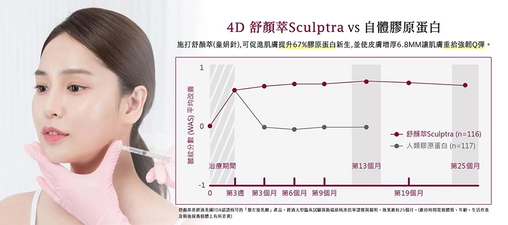 4D舒顏萃以更為全面的均衡美感為考慮,透過注射專利成分聚左旋乳酸到指定部位,即能活化肌膚、刺激膠原蛋白再生,適合用於消除靜態紋、豐頰及全臉拉提、重塑輪廓等多項訴求: