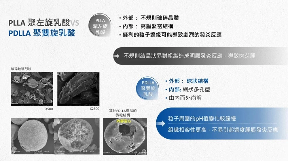 相較於其他組織增生劑成分,聚雙旋乳酸PDLLA屬於球體結構,對於人體組織相對溫和,生物相容性更高,不易因過度發炎反應造成肉芽腫或結節。同時聚雙旋乳酸PDLLA球體內部為多孔型網狀結構,更利於膠原蛋白新生(neo-collagenesis),臨床文獻證實可有效增厚真皮層厚度,提升肌膚彈力。