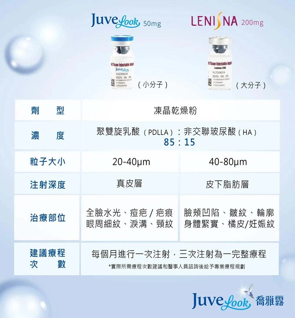 Juvelook喬雅露依照不同分子大小與適用情況,推出兩種不同劑型:Juvelook 50mg為小分子劑型與Lenisna 200mg大分子劑型,兩者均使用相同濃度之聚雙旋乳酸與玻尿酸結合而成,但兩者的微粒尺寸並不相同。